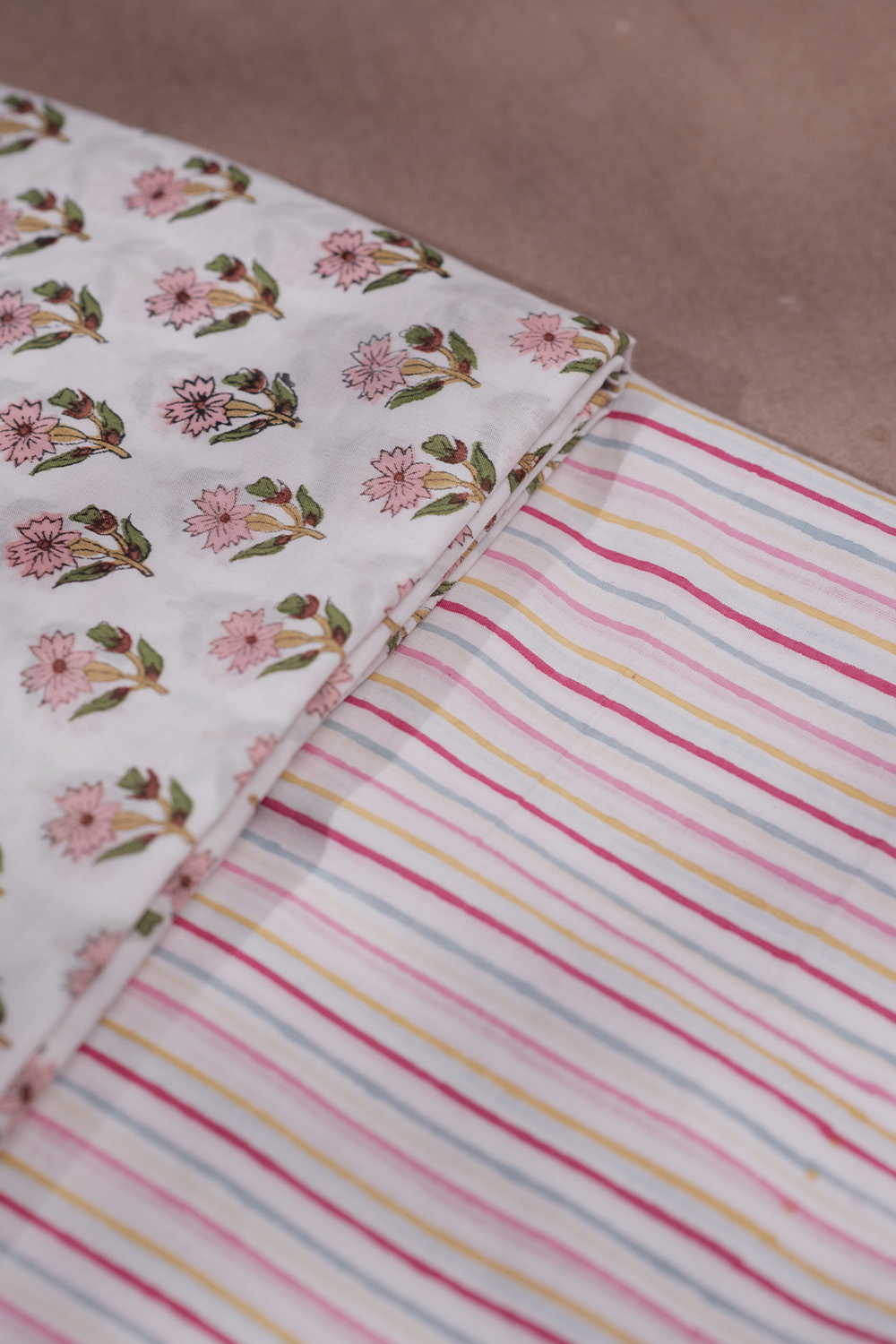 Make a statement with these Florals On Off-White Sanganeri Cotton Top with Coloured Stripe Sanganeri Cotton Bottom salwar suits dress material. Nice catchy colours and a comfortable texture makes this an all time favourite.
