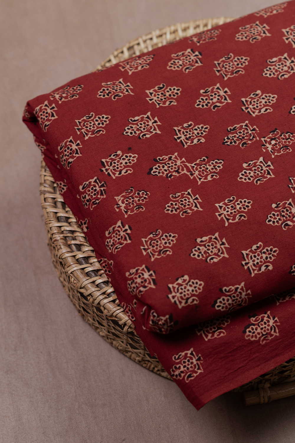 The Intricate block prints from Kutch with their Sindhi roots comes in definite geometric and floral patterns in natural shades. Ajrak is very distinct from the other styles of block printing and can be identified with the intricacy of prints and the natural tone. Soft cambric cotton fabric with Ajrak block prints - define your unique style. The Design is Parallel to the Length.