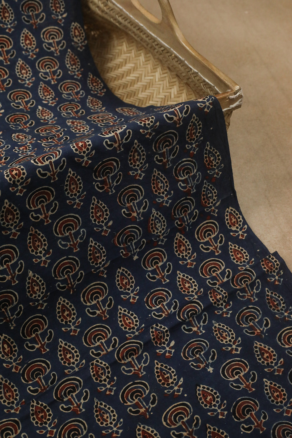 The Intricate block prints from Kutch with their Sindhi roots comes in definite geometric and floral patterns in natural shades. Ajrak is very distinct from the other styles of block printing and can be identified with the intricacy of prints and the natural tone. Soft cambric cotton fabric with Ajrak block prints - define your unique style. The Design is Parallel to the Length.
