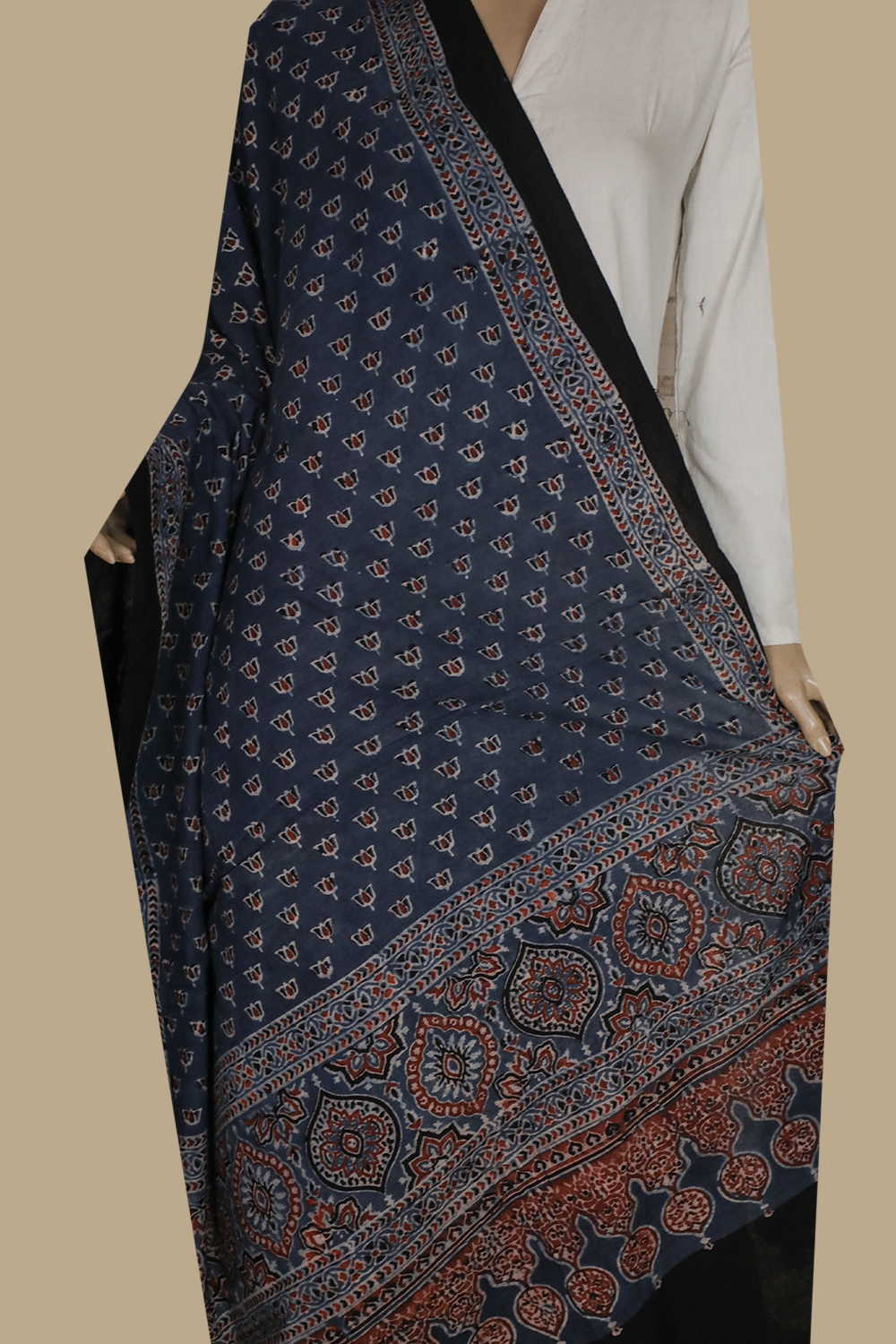 About the Dupatta: Intricate Traditional Ajrak Hand block printed cambric cotton Dupatta with tassels. Think moonless, think midnight, think darkness the star spangled sky, against a stark blue black background. This is what ajrakh is, meaning blue in Arabic.