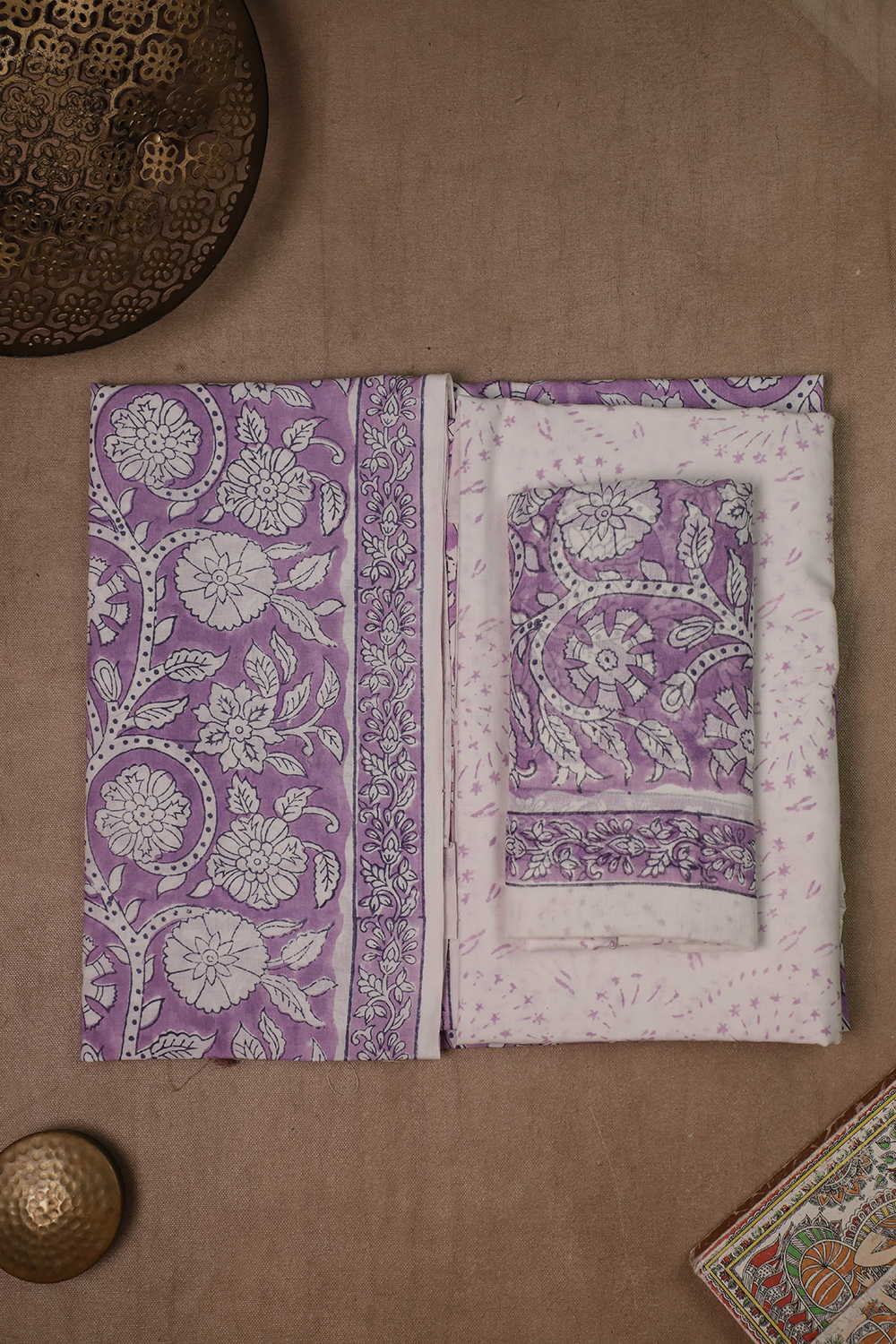 Cream Floral - Purple Block Printed Mul Cotton Suit