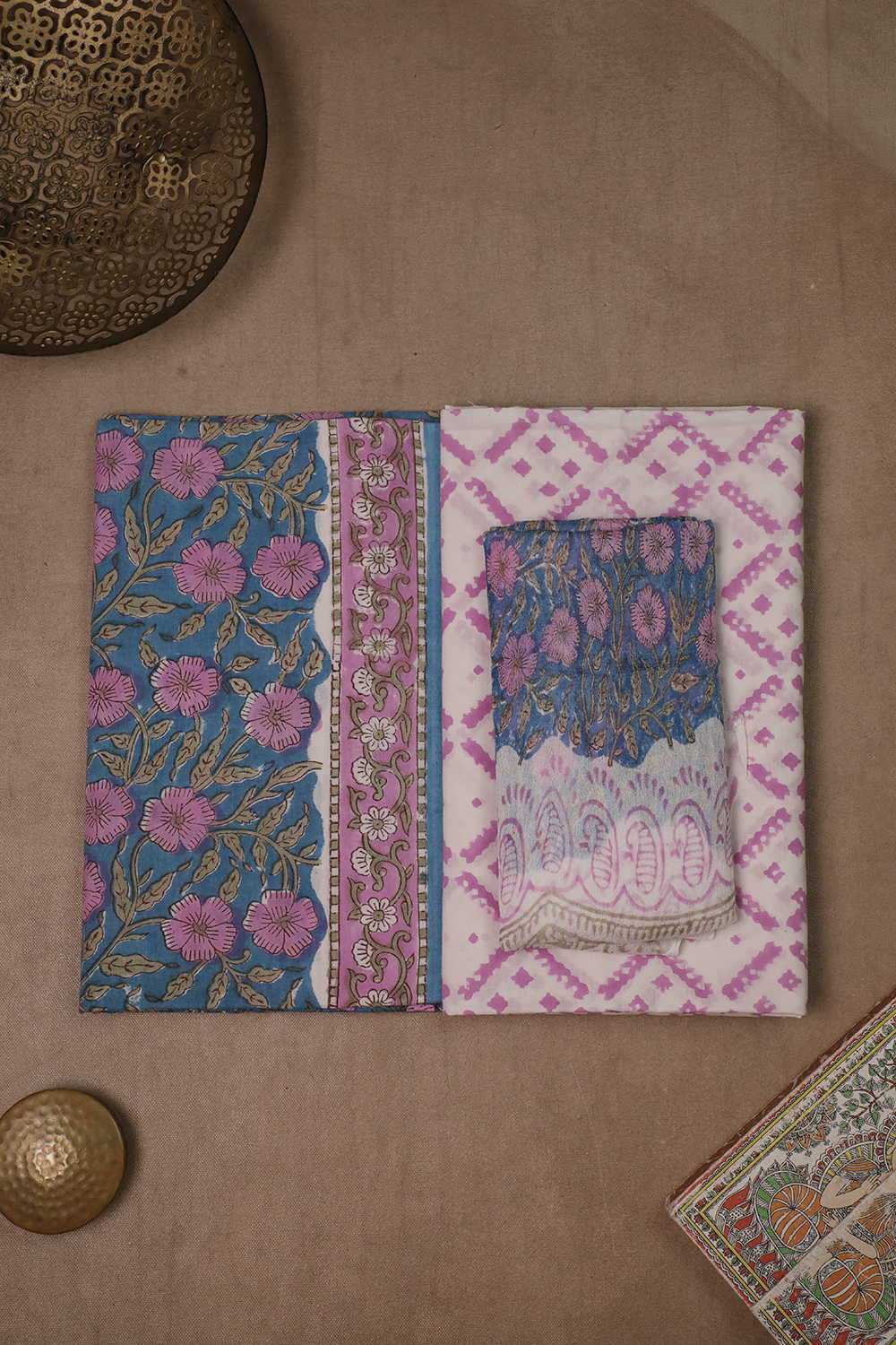 Pink Floral on Blue Block Printed Mul Cotton Suit