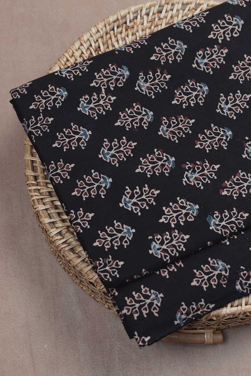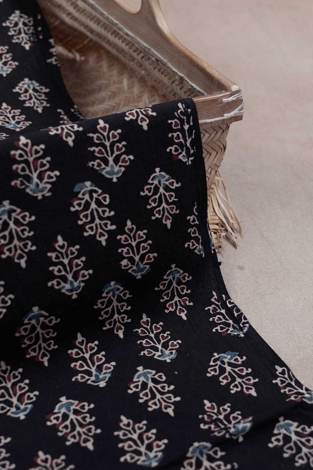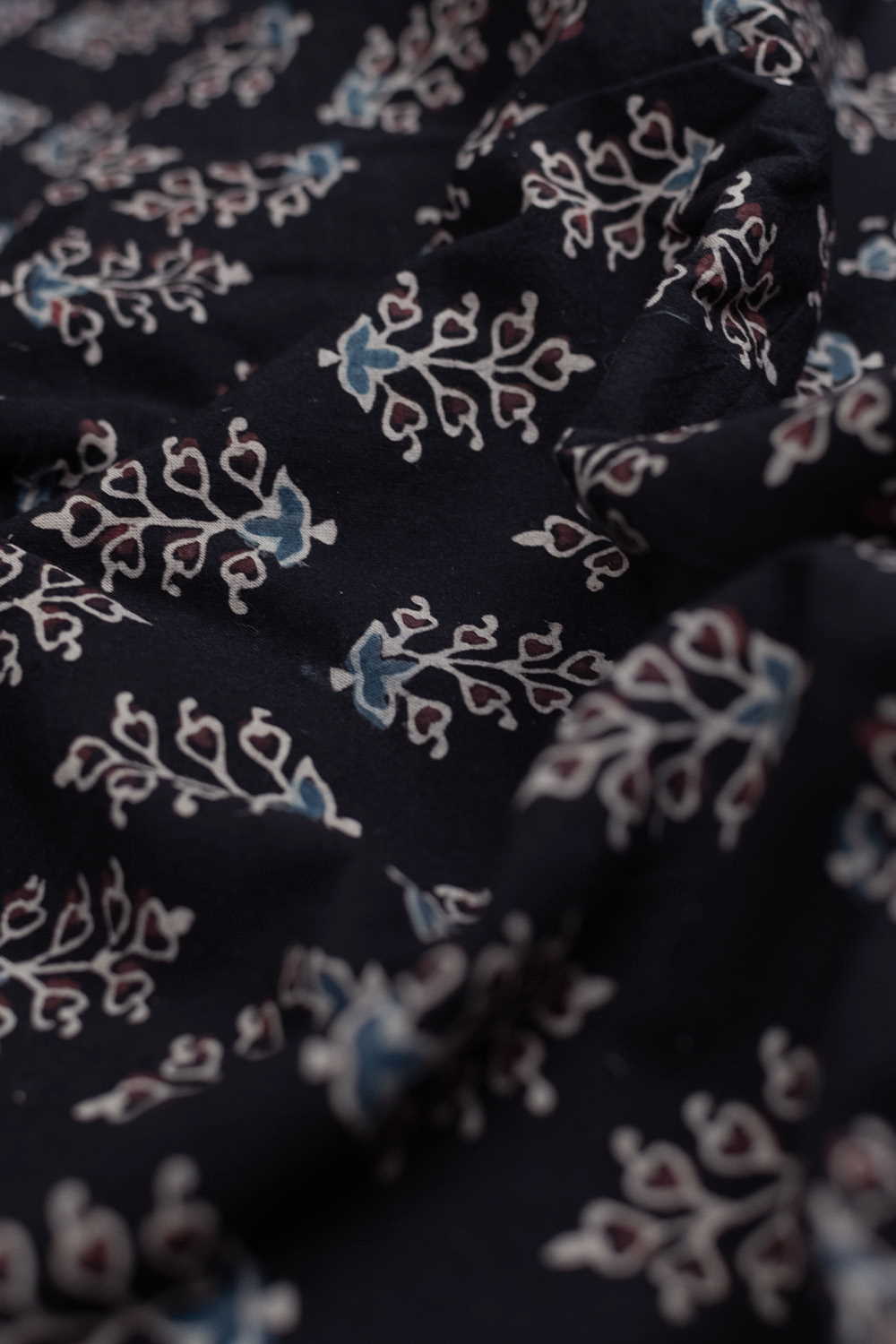 The Intricate block prints from Kutch with their Sindhi roots comes in definite geometric and floral patterns in natural shades. Ajrak is very distinct from the other styles of block printing and can be identified with the intricacy of prints and the natural tone. Soft cambric cotton fabric with Ajrak block prints - define your unique style. The Design is Parallel to the Length.
