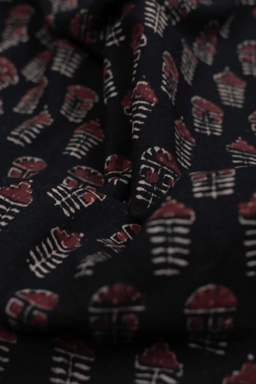 The Intricate block prints from Kutch with their Sindhi roots comes in definite geometric and floral patterns in natural shades. Ajrak is very distinct from the other styles of block printing and can be identified with the intricacy of prints and the natural tone. Soft cambric cotton fabric with Ajrak block prints - define your unique style. The Design is Parallel to the Length.