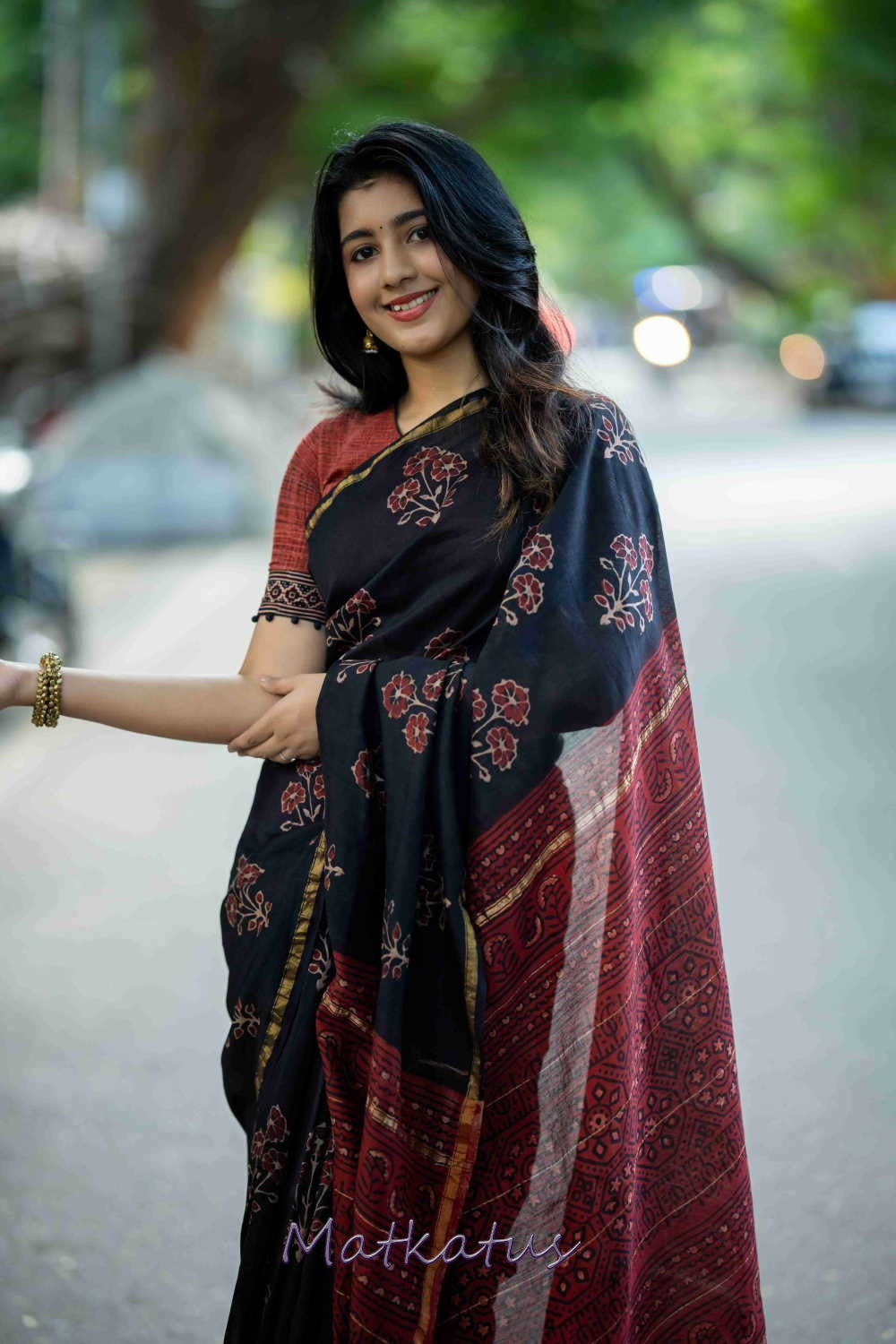 Floral Butta on Black Ajrak Maheshwari Silk Cotton saree