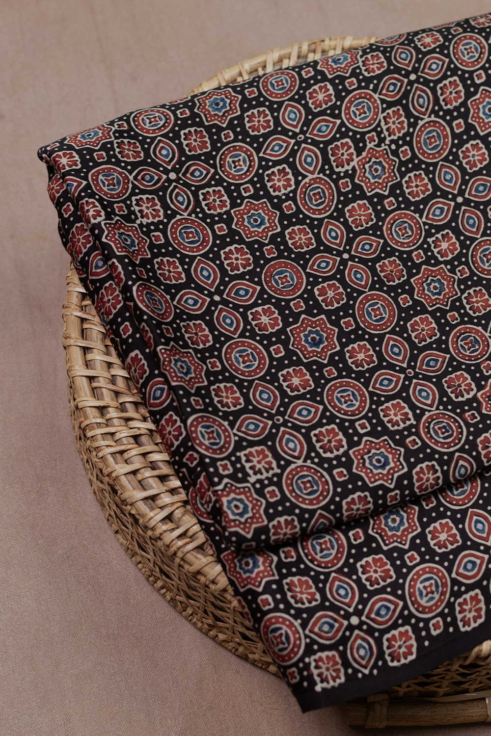 Black with Maroon Motifs Ajrak Modal Silk Fabric