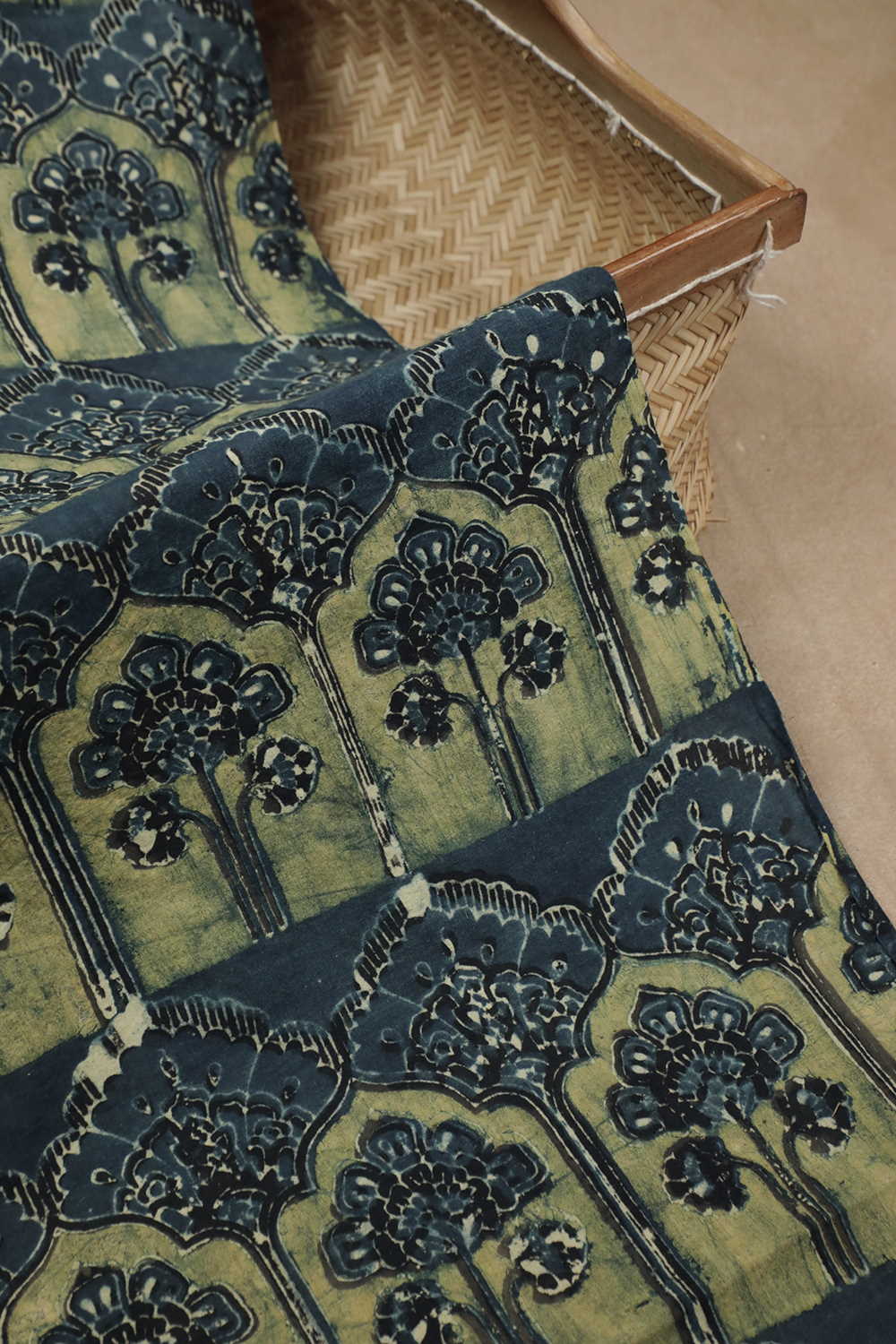 The Intricate block prints from Kutch with their Sindhi roots comes in definite geometric and floral patterns in natural shades. Ajrak is very distinct from the other styles of block printing and can be identified with the intricacy of prints and the natural tone. Soft cambric cotton fabric with Ajrak block prints - define your unique style. The Design is Parallel to the Length.