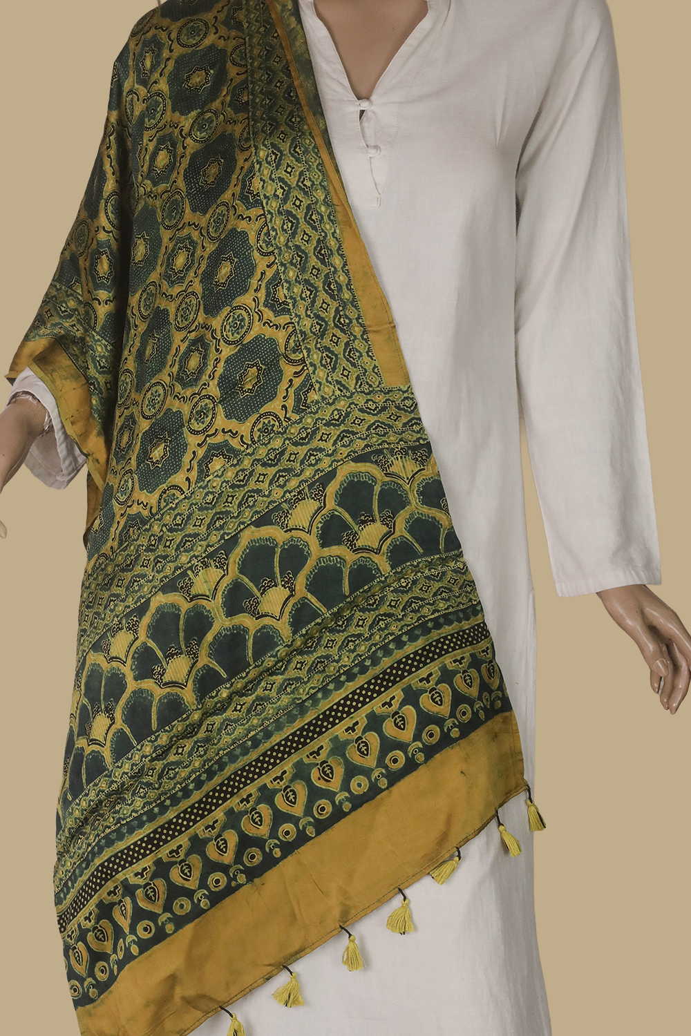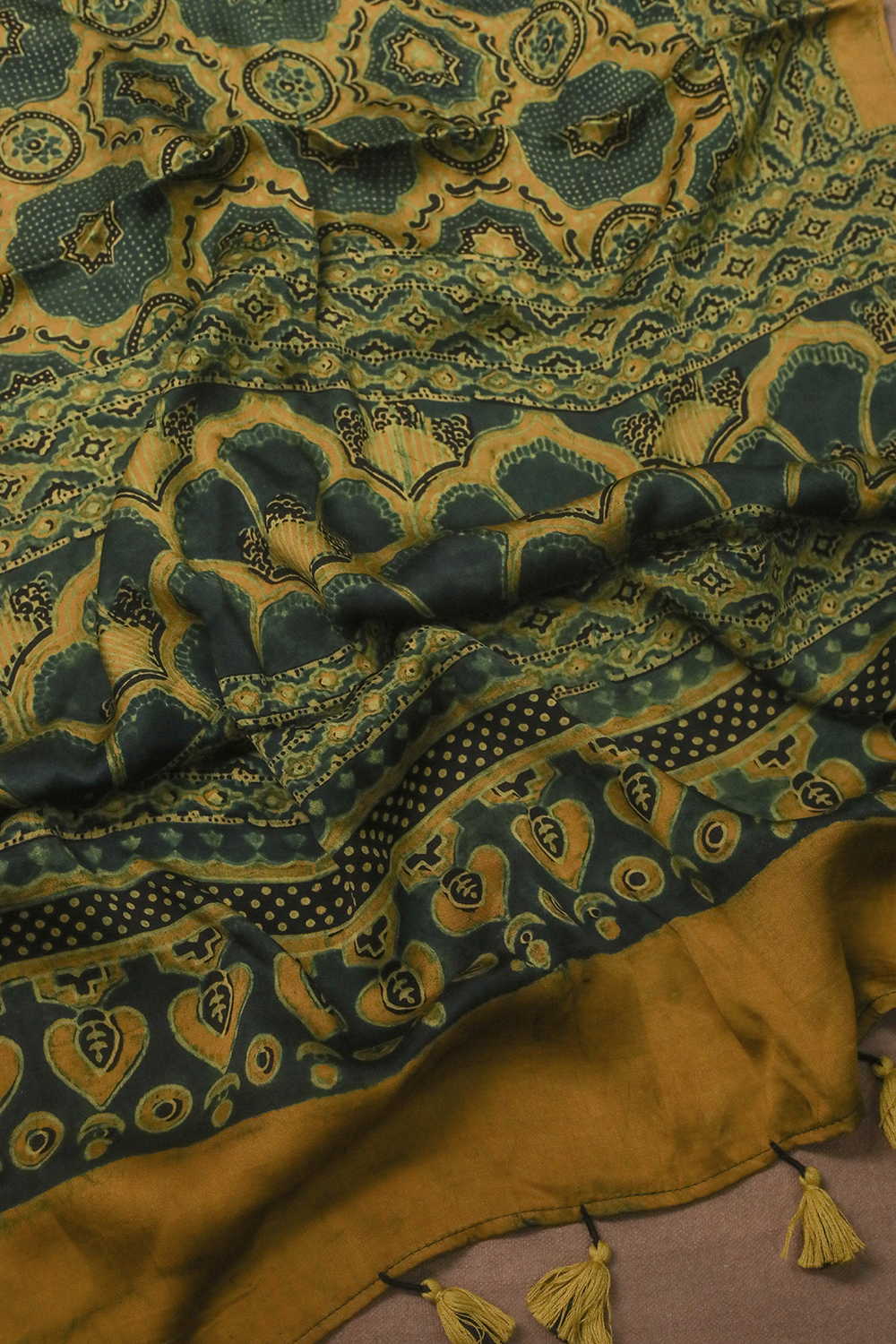 Green Patterns on Yellow Ajrak Modal Silk Stole