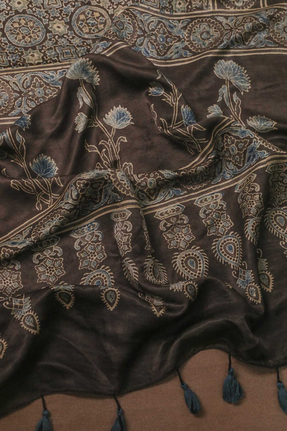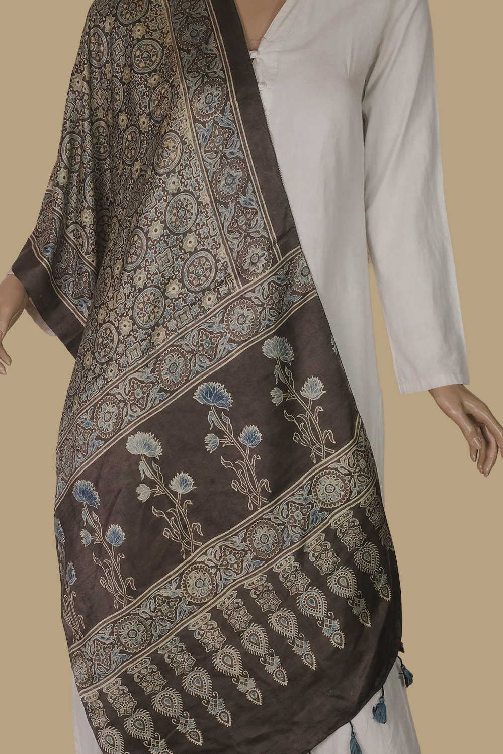 Exquisitely Hand Block Printed Ajrak Stole in Gajji Silk. Soft and comfortable, it sure would feel good around your neck. Ajrak is a traditional intricate hand block printing technique, where the use of natural colours and geometric patterns together spells Magic