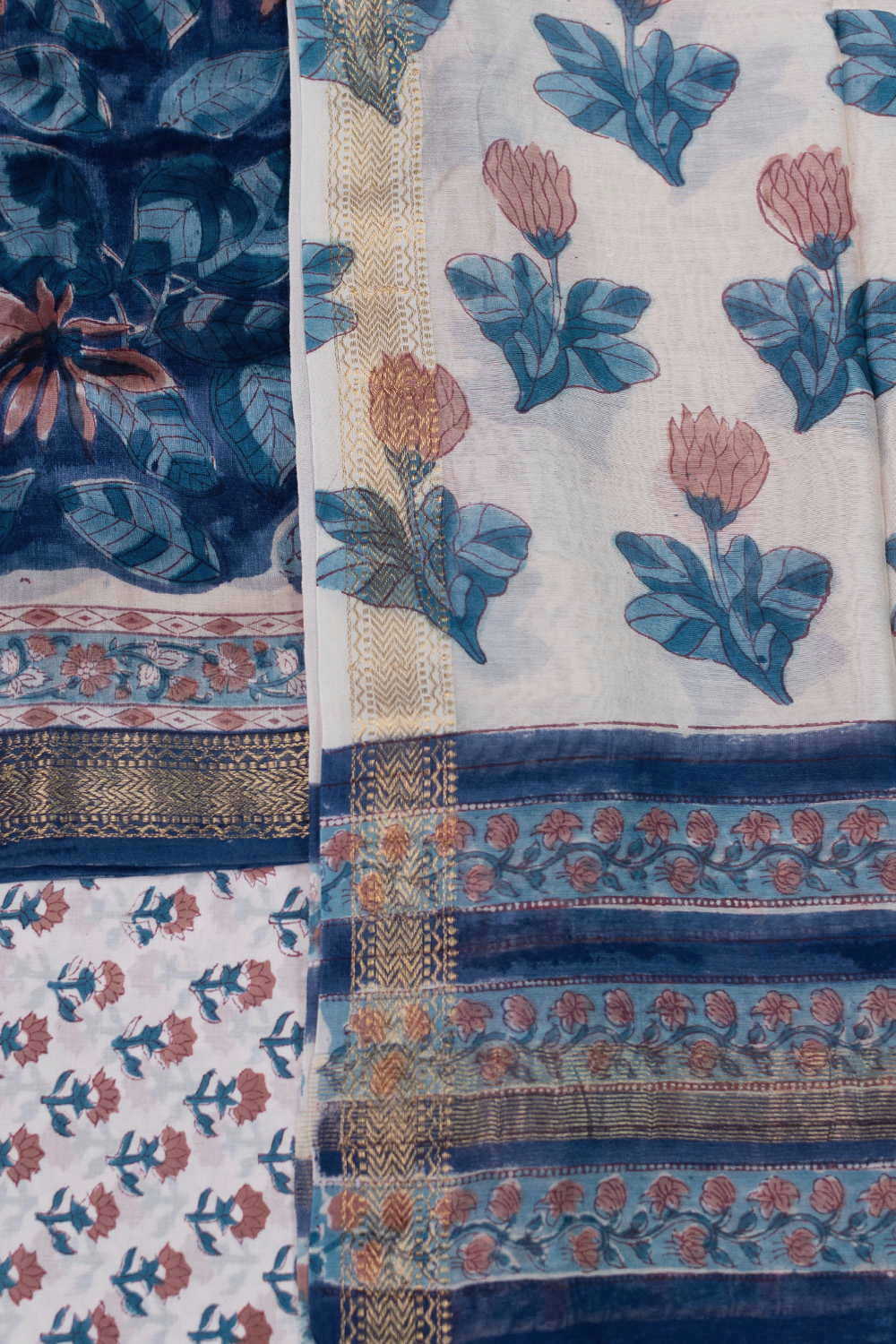 Hand block printed Chanderi silk cotton Top and Dupatta with Block Printed Cotton Bottom unstitched salwar kameez suit.