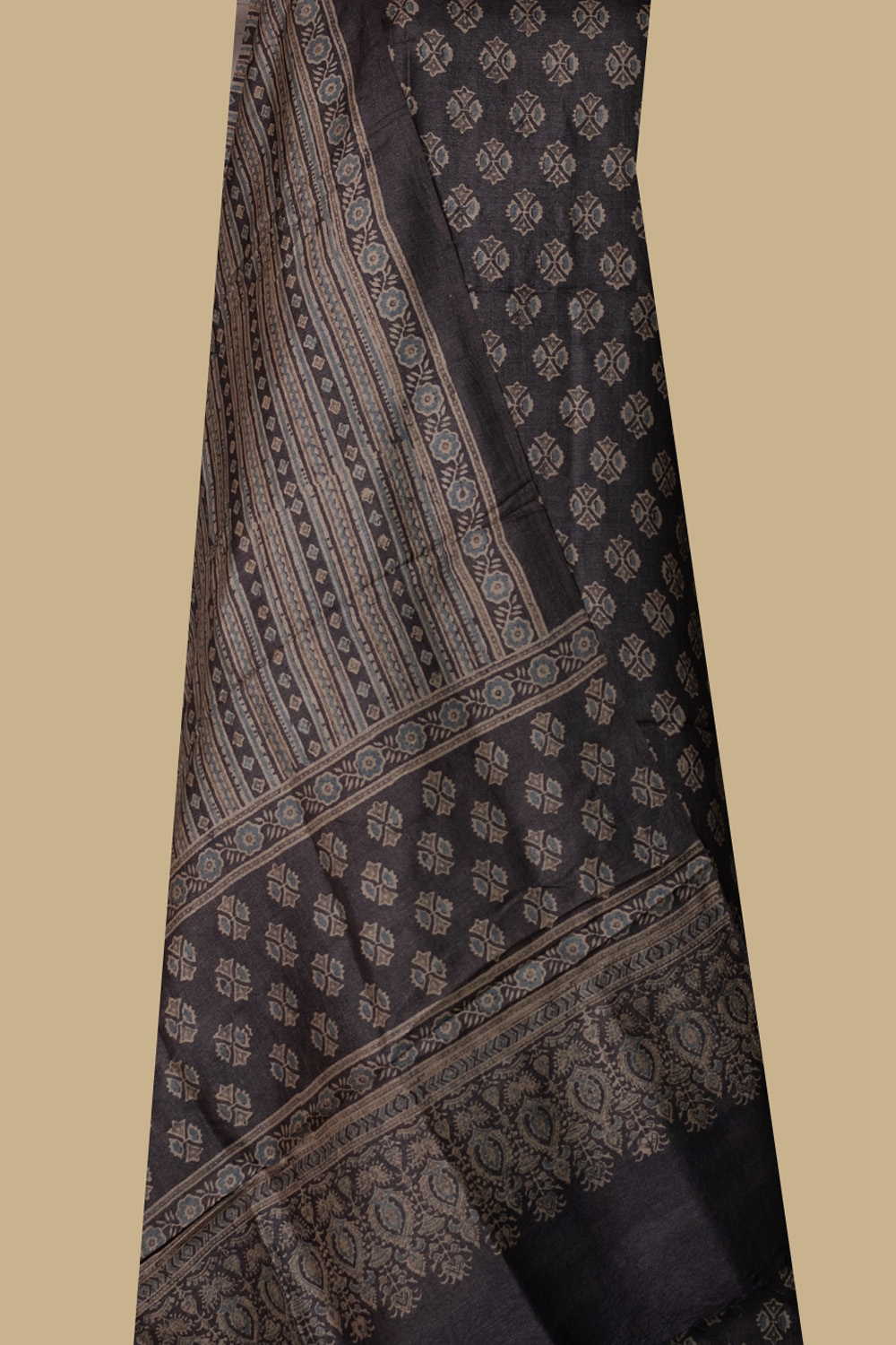 Block Printed Ajrak Tussar Silk Top & Dupatta Slightly coarse lightweight, intricately designed and comfortable to drape - ideal wear for any weather. The subtle ajrak block prints, added to the earthen colours of the fabric, make their own unique style statement.