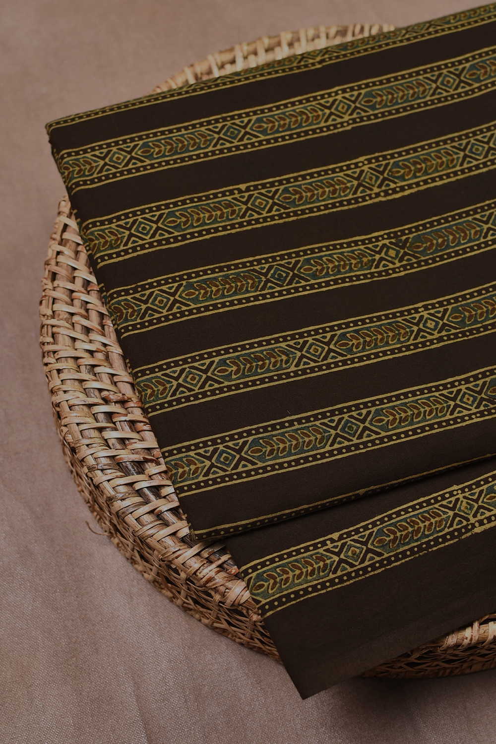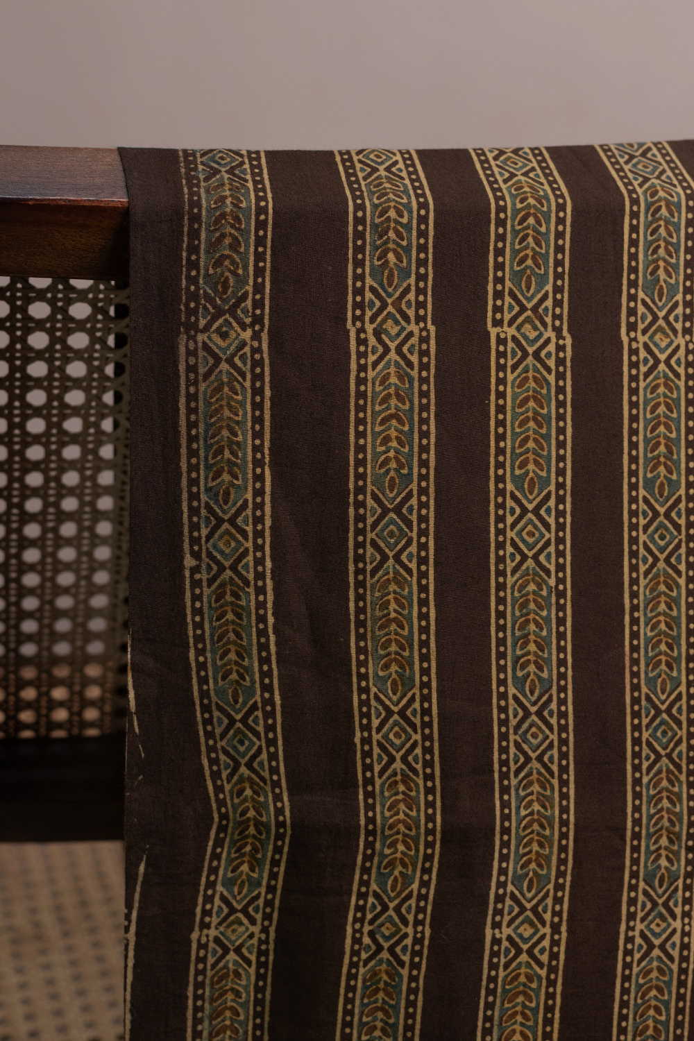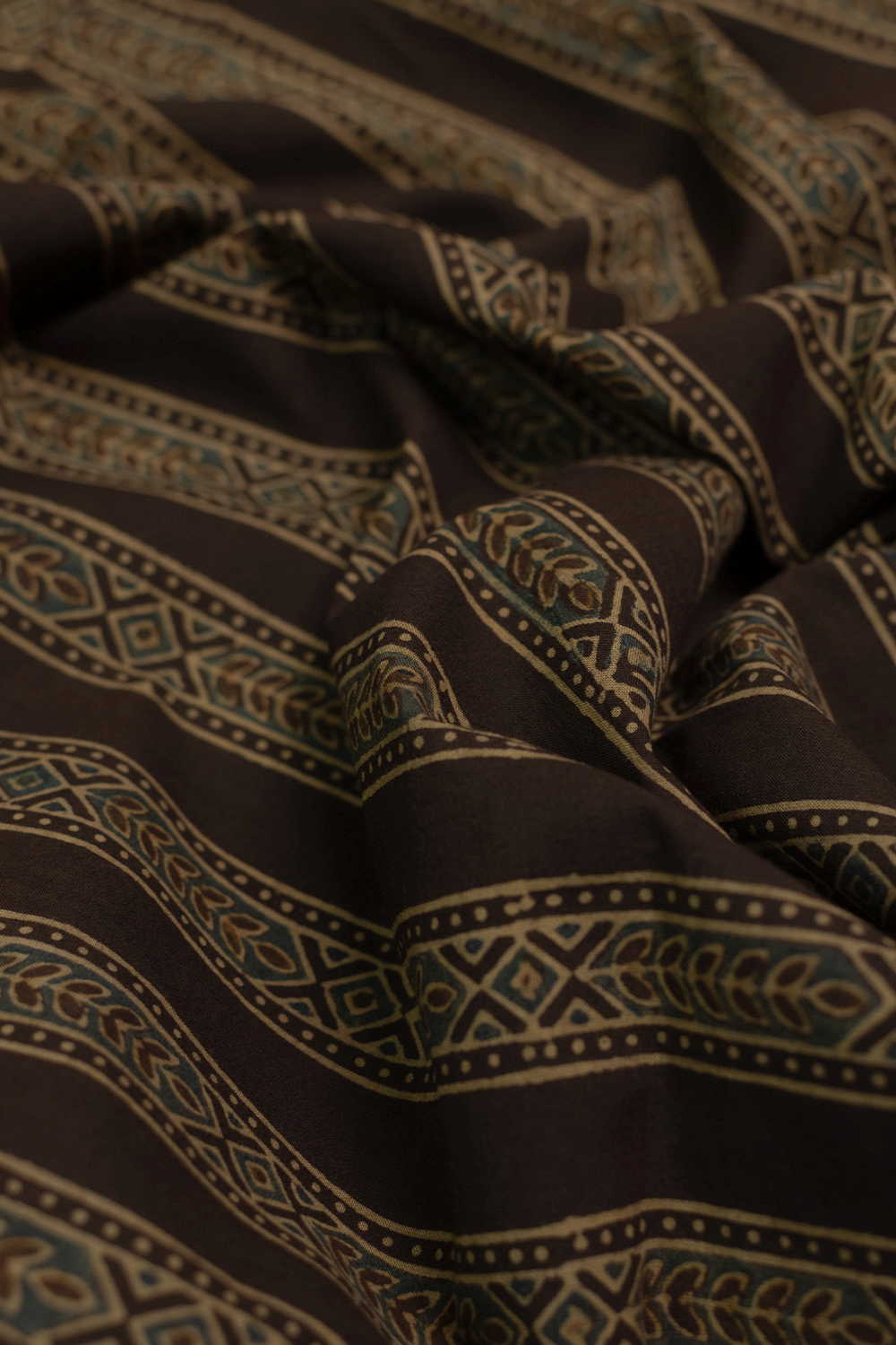 The Intricate block prints from Kutch with their Sindhi roots comes in definite geometric and floral patterns in natural shades. Ajrak is very distinct from the other styles of block printing and can be identified with the intricacy of prints and the natural tone. Soft cambric cotton fabric with Ajrak block prints - define your unique style. The Design is Parallel to the Length.