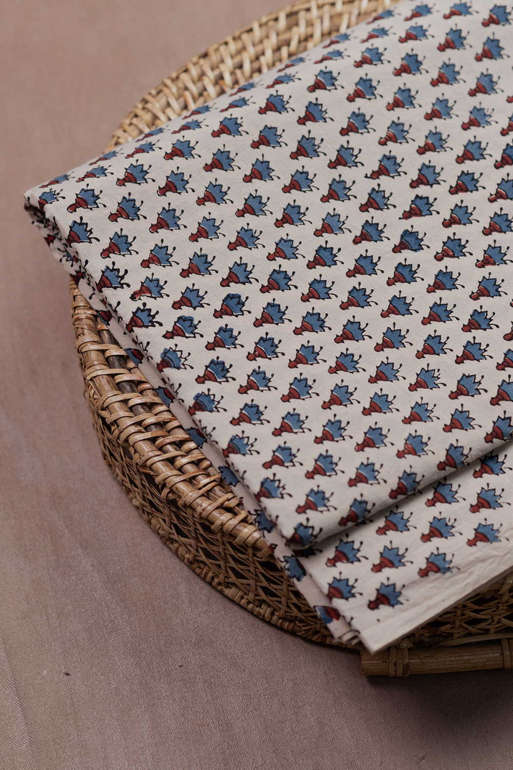 The Intricate block prints from Kutch with their Sindhi roots comes in definite geometric and floral patterns in natural shades. Ajrak is very distinct from the other styles of block printing and can be identified with the intricacy of prints and the natural tone. Soft cambric cotton fabric with Ajrak block prints - define your unique style. The Design is Parallel to the Length.