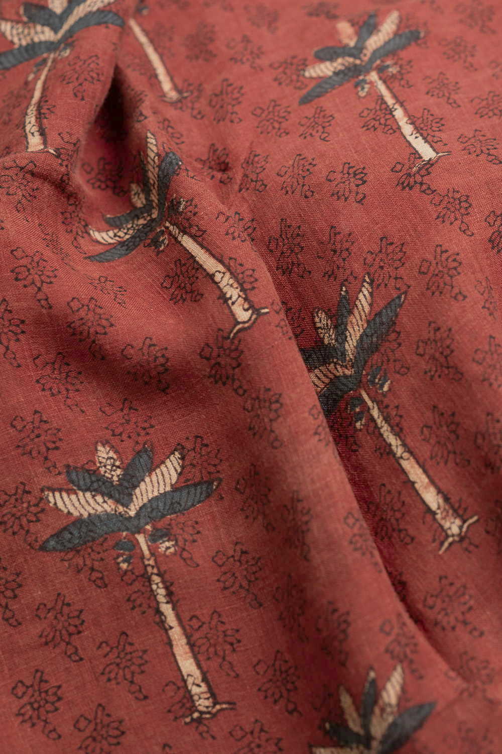 Buy Beautifully Hand Block Printed Ajrakh on Linen at Matkatus Online. The subtle texture of Linen with the Vibrant prints of Ajrak make this a go to choice on any day. The fabric is textured and has a comforting feel. The design is parallel to length.