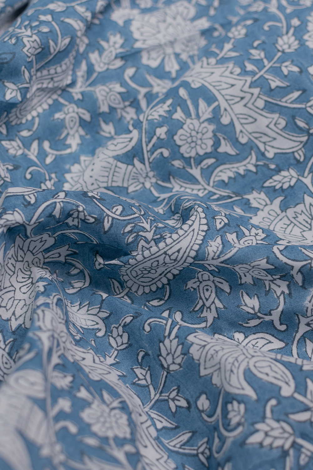Cream Floral on Blue Sanganeri Cotton Fabric - 0.5m