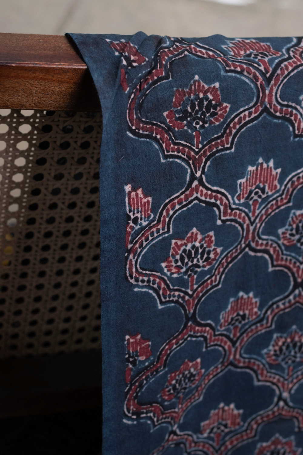 The Intricate block prints from Kutch with their Sindhi roots comes in definite geometric and floral patterns in natural shades. Ajrak is very distinct from the other styles of block printing and can be identified with the intricacy of prints and the natural tone. Soft cambric cotton fabric with Ajrak block prints - define your unique style. The Design is Parallel to the Length.