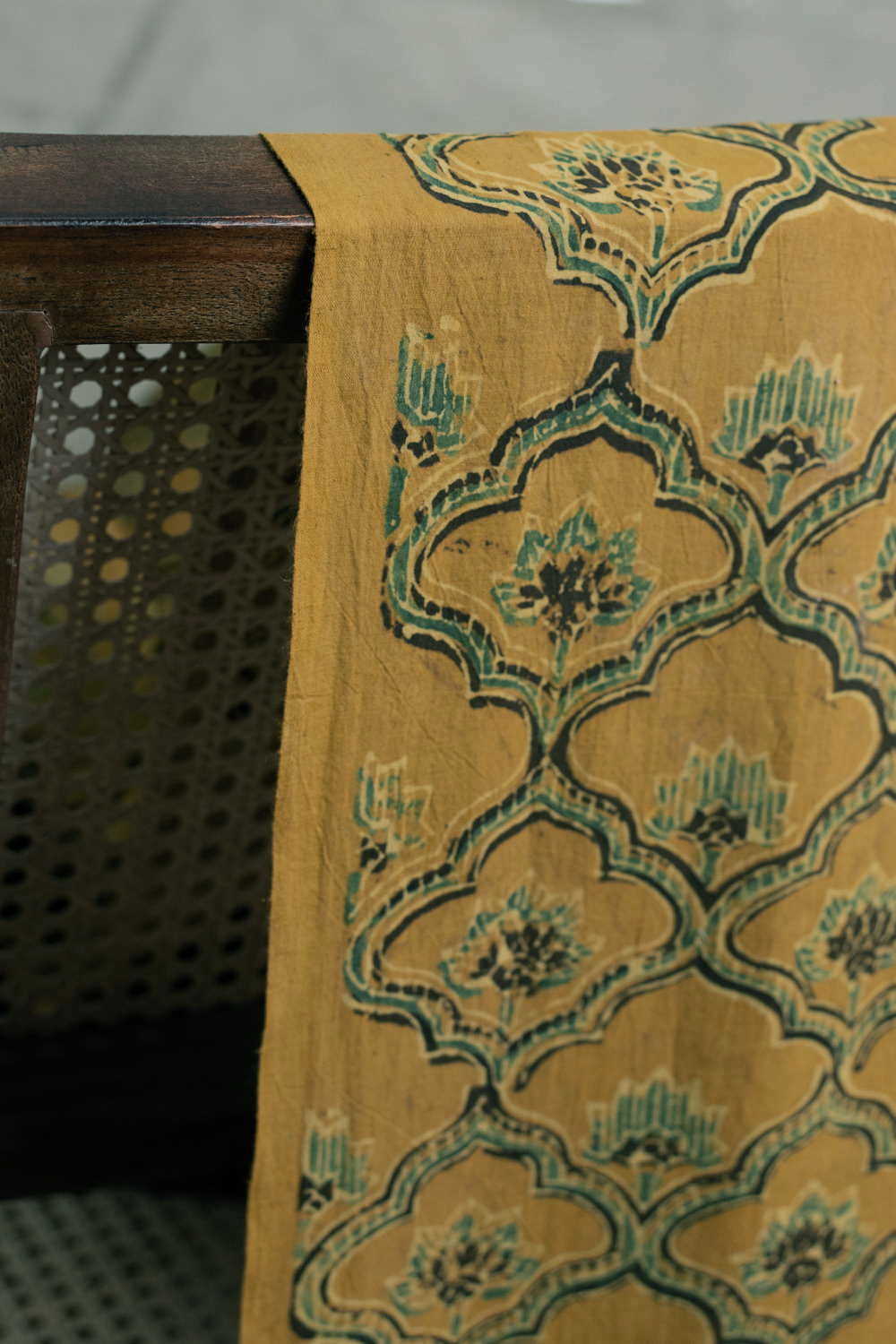 Yellow with Green Floral Pattern Ajrak Cotton Fabric - 1m