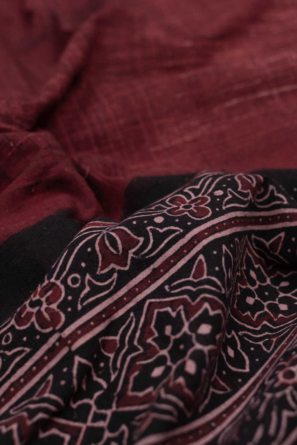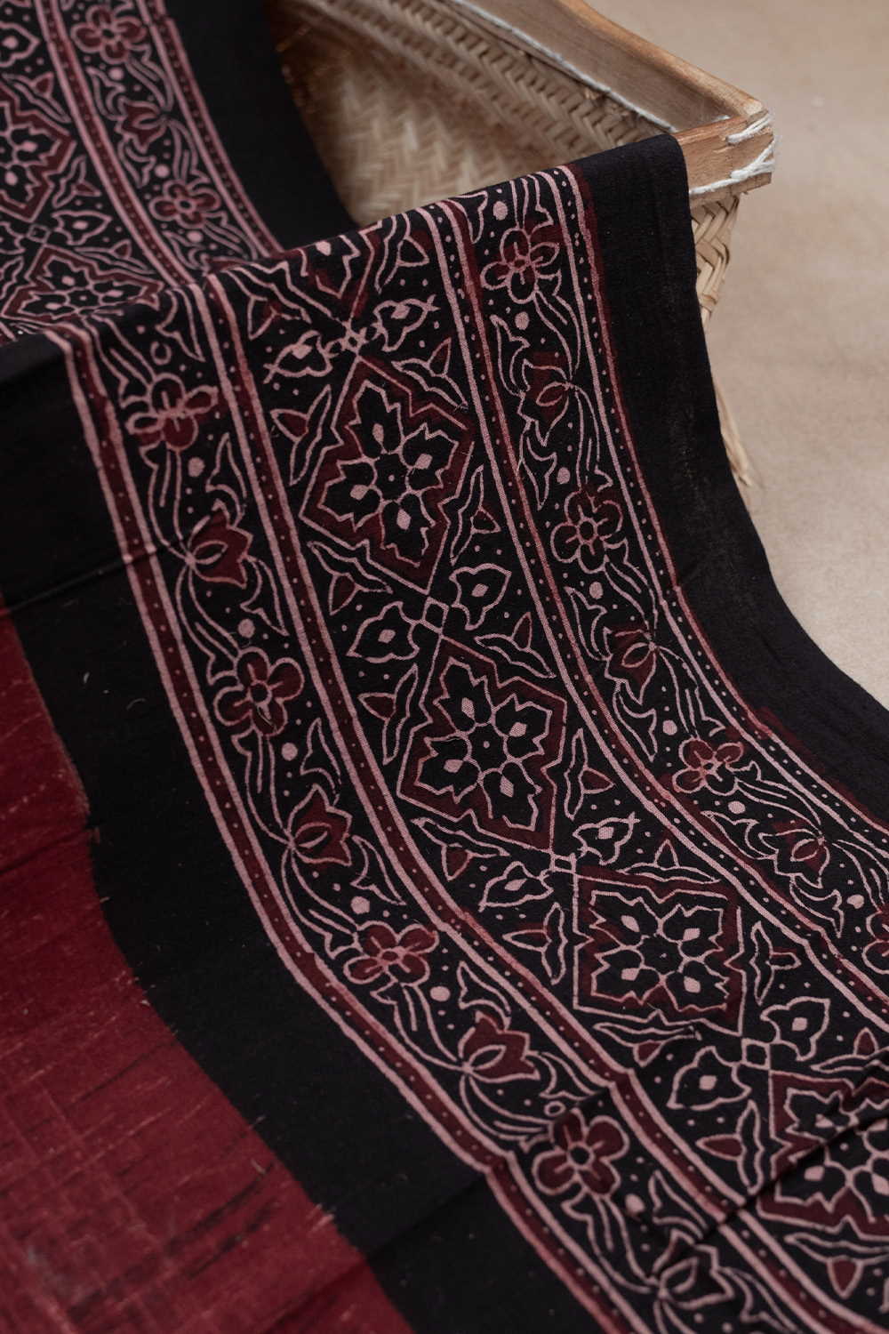 The Intricate block prints from Kutch with their Sindhi roots comes in definite geometric and floral patterns in natural shades. Ajrak is very distinct from the other styles of block printing and can be identified with the intricacy of prints and the natural tone. Soft cambric cotton fabric with Ajrak block prints - define your unique style. The Design is Parallel to the Length. The Fabric comes with one side border.