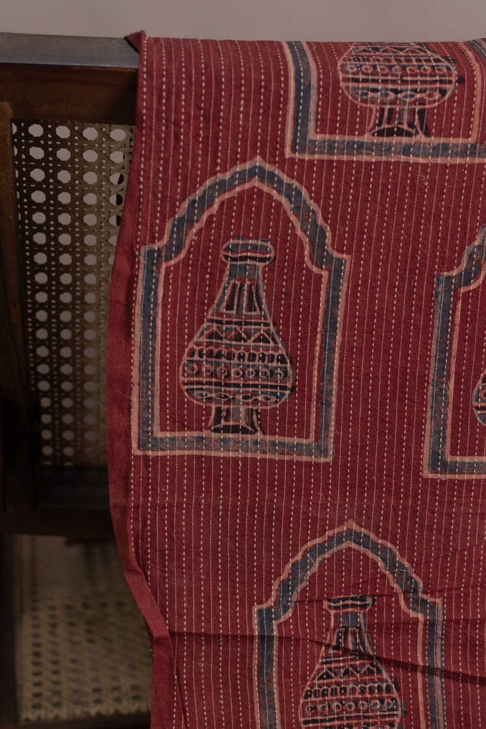 Scarlet Maroon Kantha Stitched Ajrak Cotton Fabric