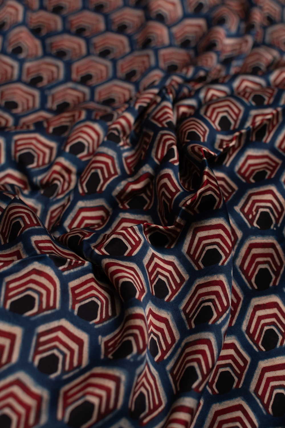 Soft Silky texture on the outside and comfortable cotton feel on the inside, thats what distinctly marks the modal silk. The Dreamy Ajrak Prints on the modal silk has a flowy, ethereal feel to it. The fabric would suit any silhouette. Design is parallel to Length.