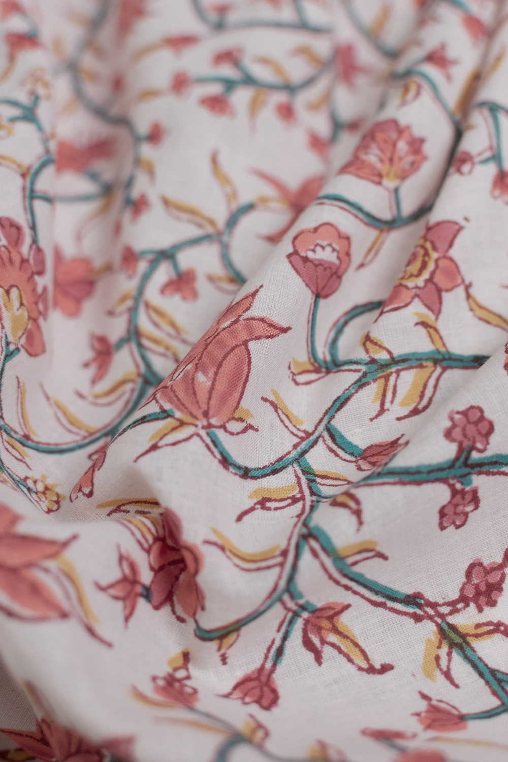 Floral Sanganeri imprints on soft cambric cotton brings with it the elusive elegance to add charm to your presence. Ideal for blouses, kurtas, kids dresses, cotton pants and anything in your stretch of imagination. The base fabric is thin and soft cotton. The design is parallel to the Length.