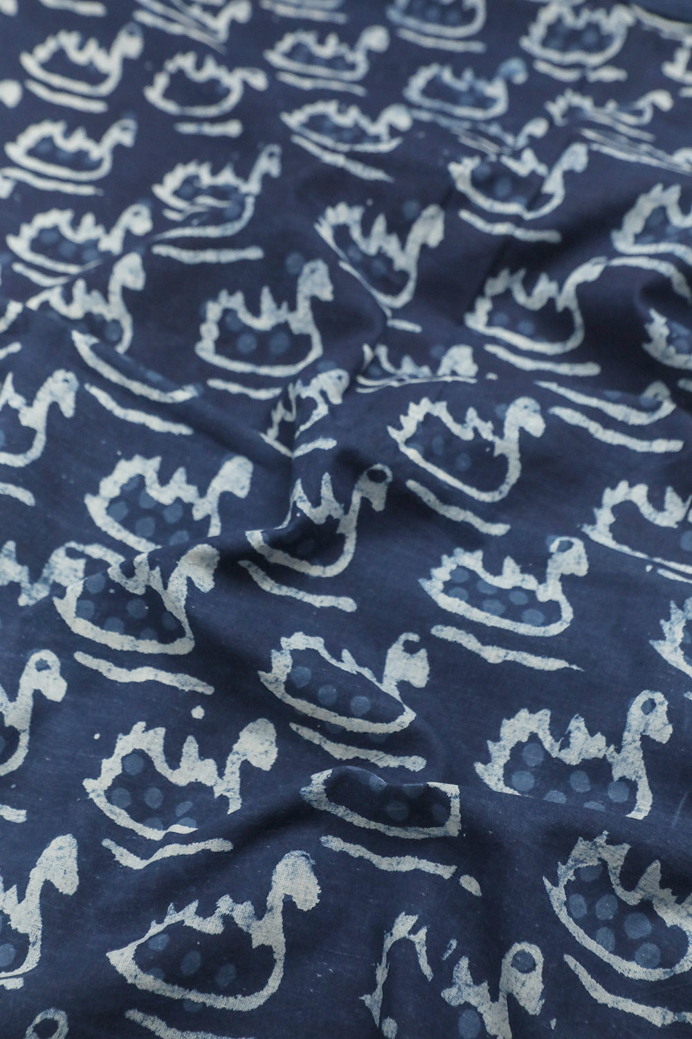 Swans on Indigo Block Printed Cotton Fabric - 1.3m