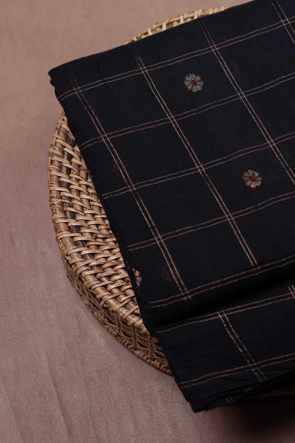 Zari Blossom Checks - Black Jamdani Cotton Fabric