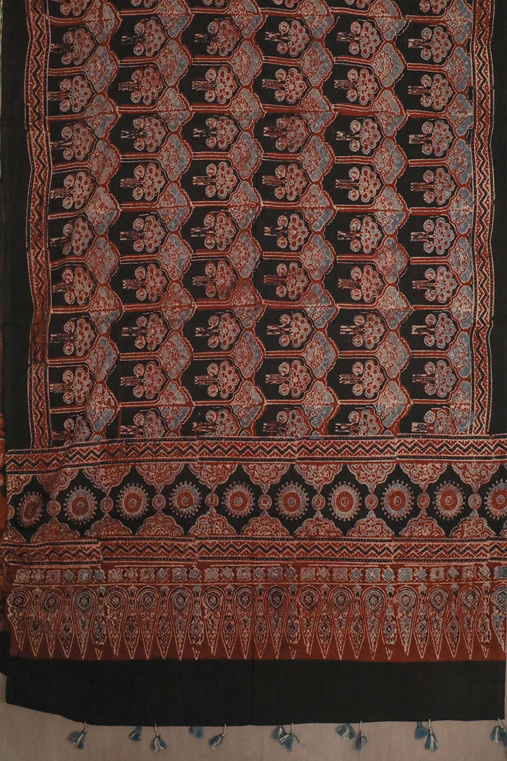 About the Dupatta: Intricate Traditional Ajrak Hand block printed cambric cotton Dupatta with tassels. Think moonless, think midnight, think darkness the star spangled sky, against a stark blue black background. This is what ajrakh is, meaning blue in Arabic.