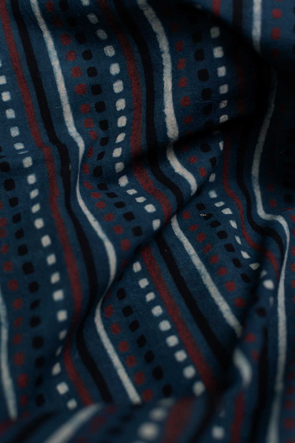 The Intricate block prints from Kutch with their Sindhi roots comes in definite geometric and floral patterns in natural shades. Ajrak is very distinct from the other styles of block printing and can be identified with the intricacy of prints and the natural tone. Soft cambric cotton fabric with Ajrak block prints - define your unique style. The Design is Parallel to the Length.
