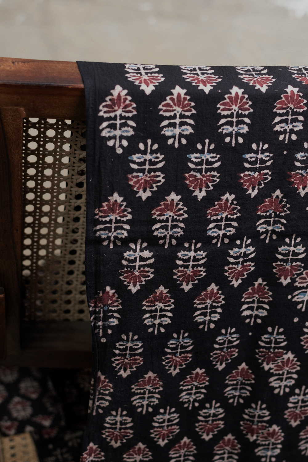 Maroon Florets - Black Ajrak Cotton Fabric - 0.85m