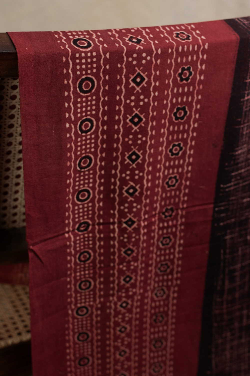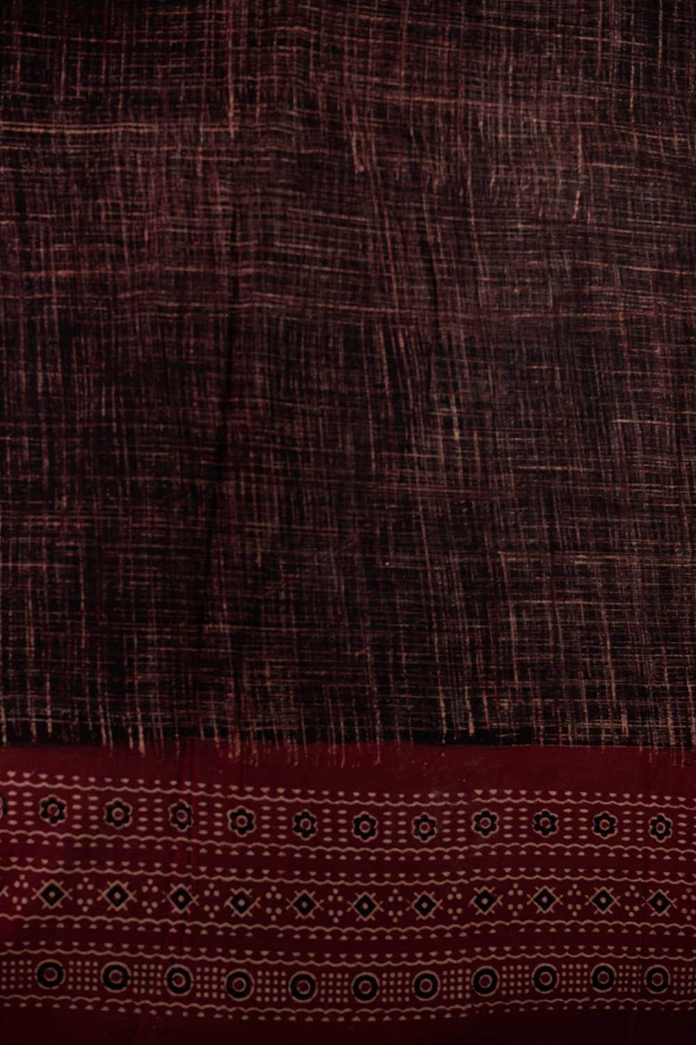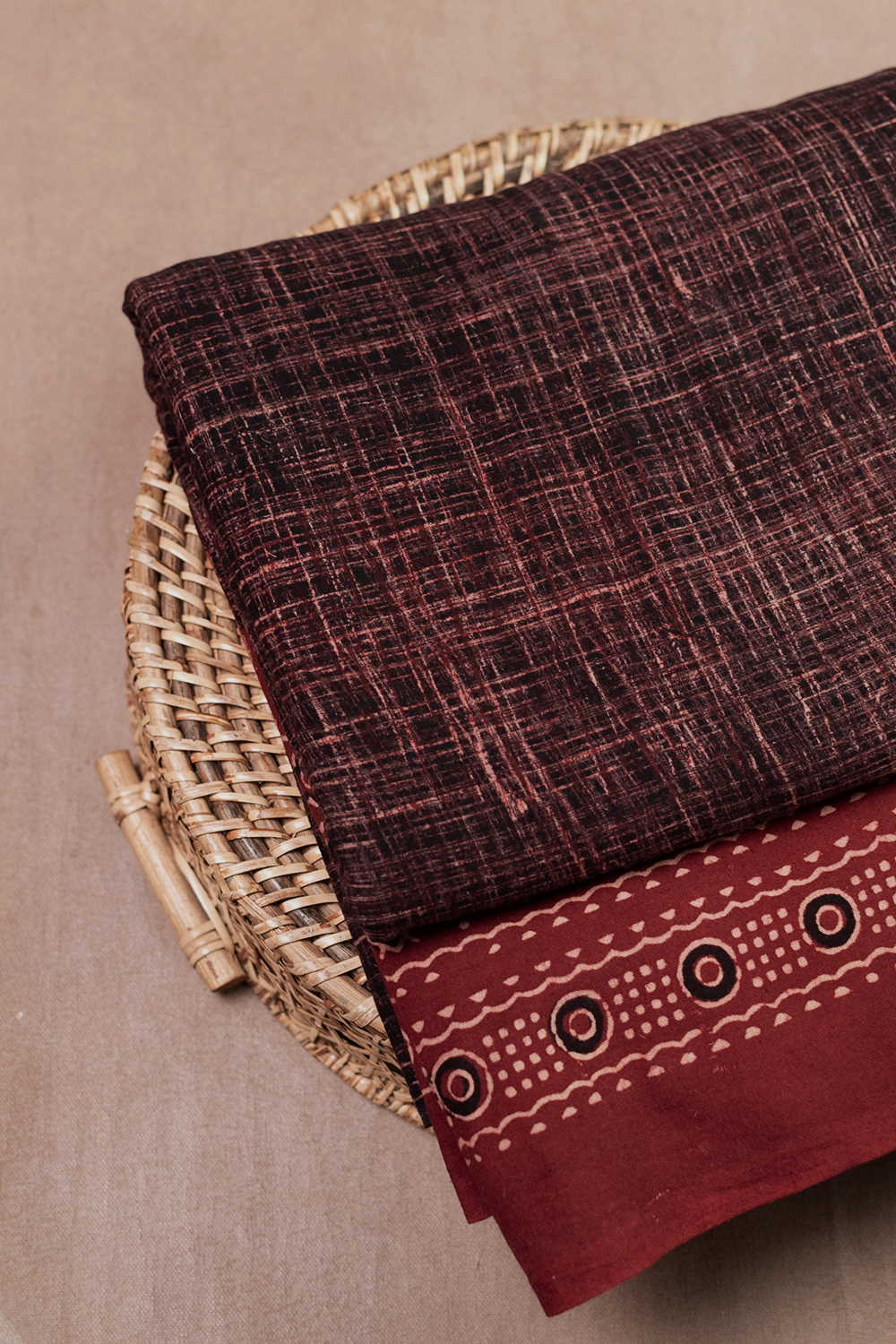 The Intricate block prints from Kutch with their Sindhi roots comes in definite geometric and floral patterns in natural shades. Ajrak is very distinct from the other styles of block printing and can be identified with the intricacy of prints and the natural tone. Soft cambric cotton fabric with Ajrak block prints - define your unique style. The Design is Parallel to the Length.