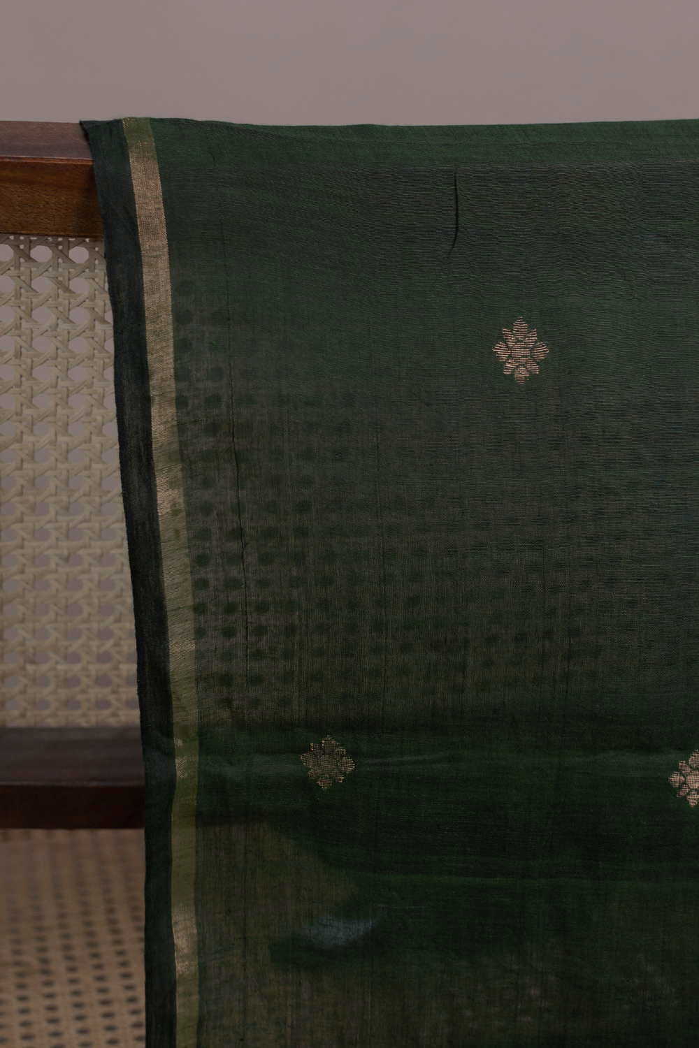 Dark Green with Zari Butta Jamdani Cotton Fabric - 1m