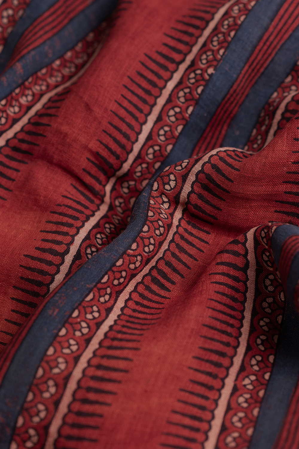 Buy Beautifully Hand Block Printed Ajrakh on Linen at Matkatus Online. The subtle texture of Linen with the Vibrant prints of Ajrak make this a go to choice on any day. The fabric is textured and has a comforting feel. The design is parallel to length.