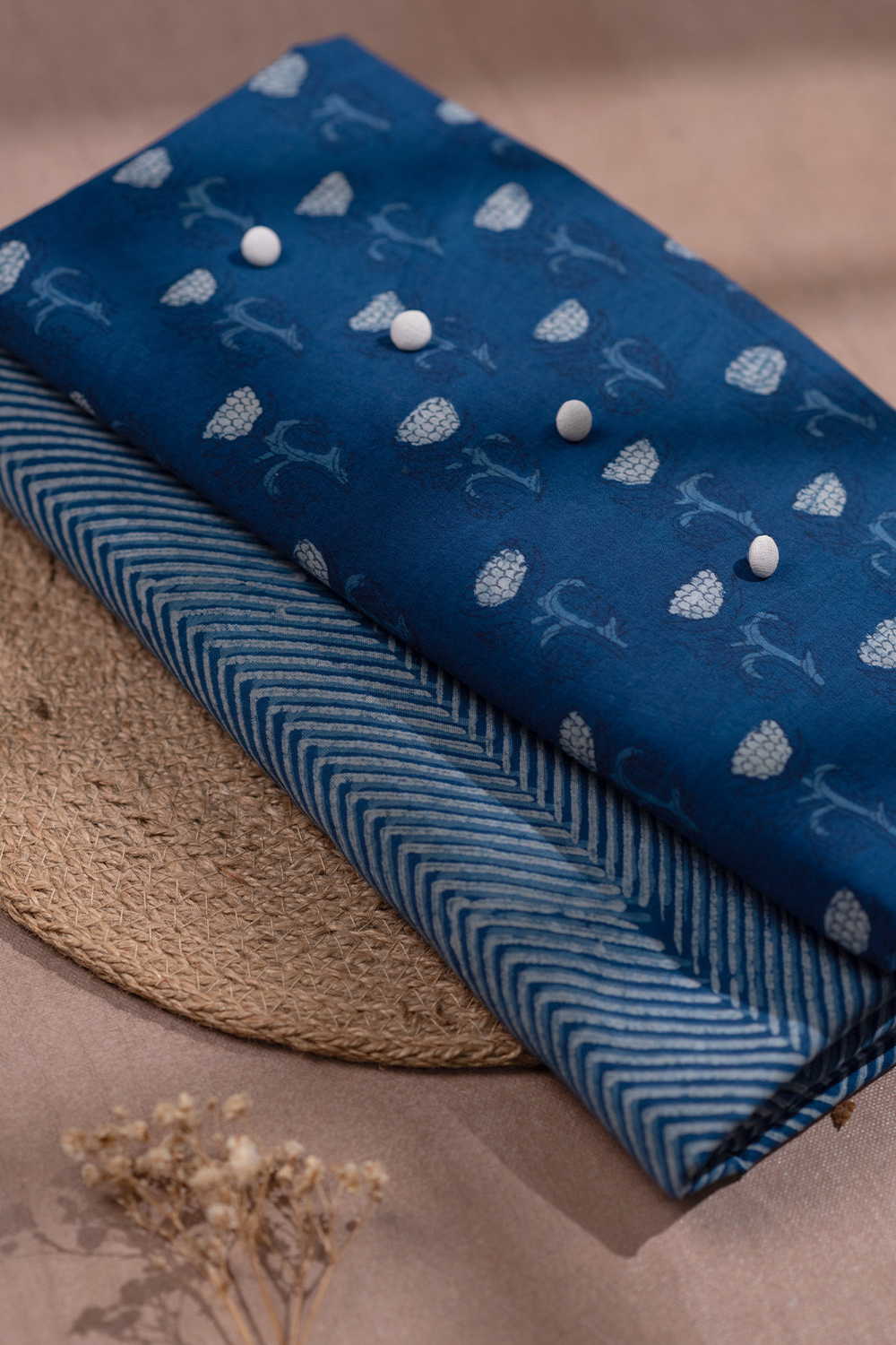 Make a statement with these Cream Florets on Indigo Dabu Cotton Top with Chevron - Indigo Dabu Cotton Bottom salwar suits dress material. Nice catchy colours and a comfortable texture makes this an all time favourite.