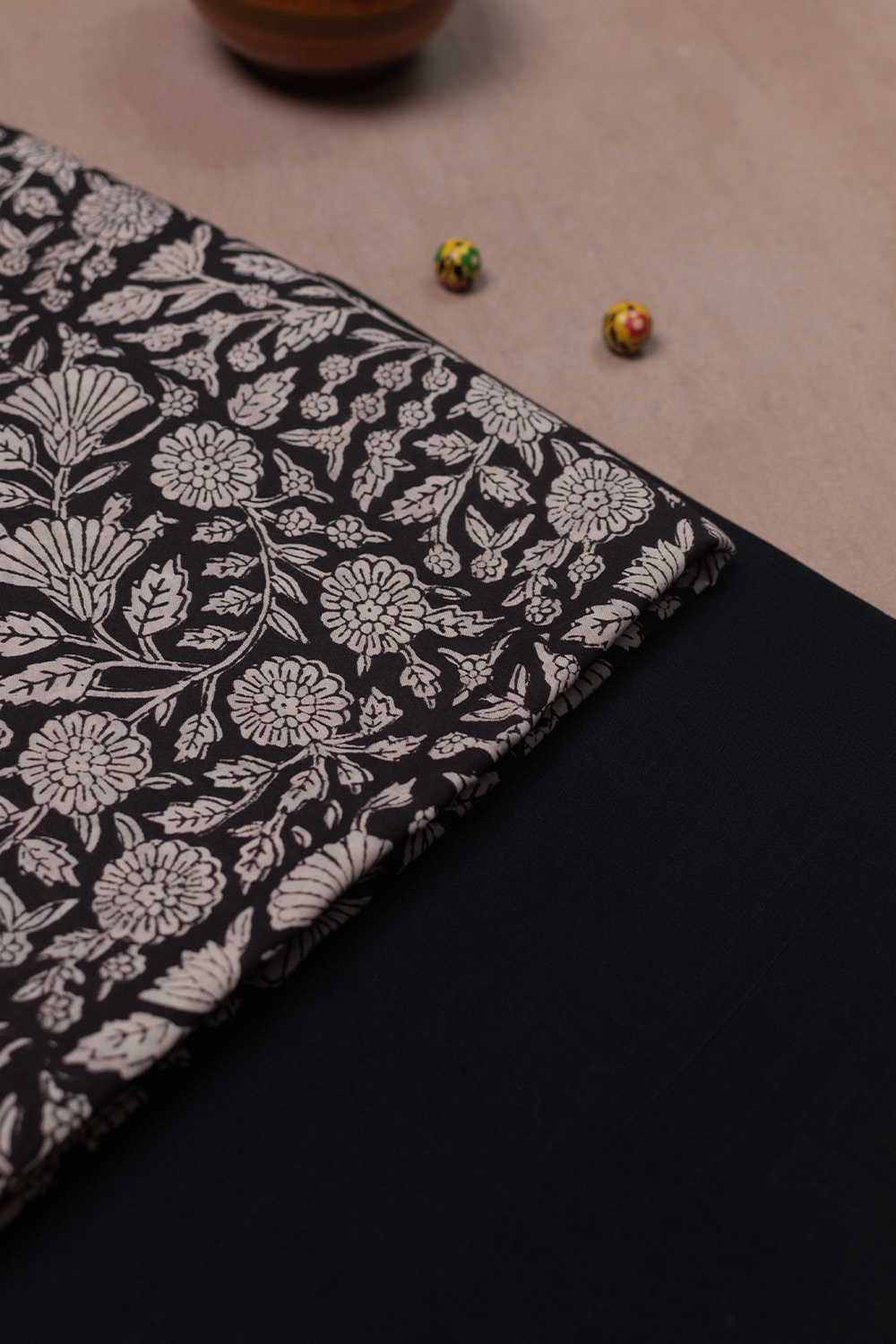 Make a statement with these Black Floral Garden Bagru Cotton Top with Pitch Black Handwoven Cotton Bottom salwar suits dress material. Nice catchy colours and a comfortable texture makes this an all time favourite.